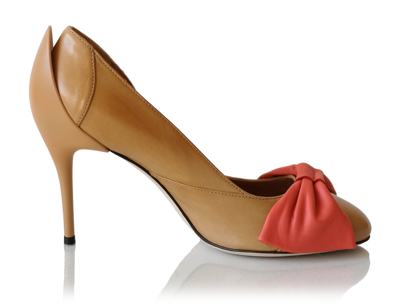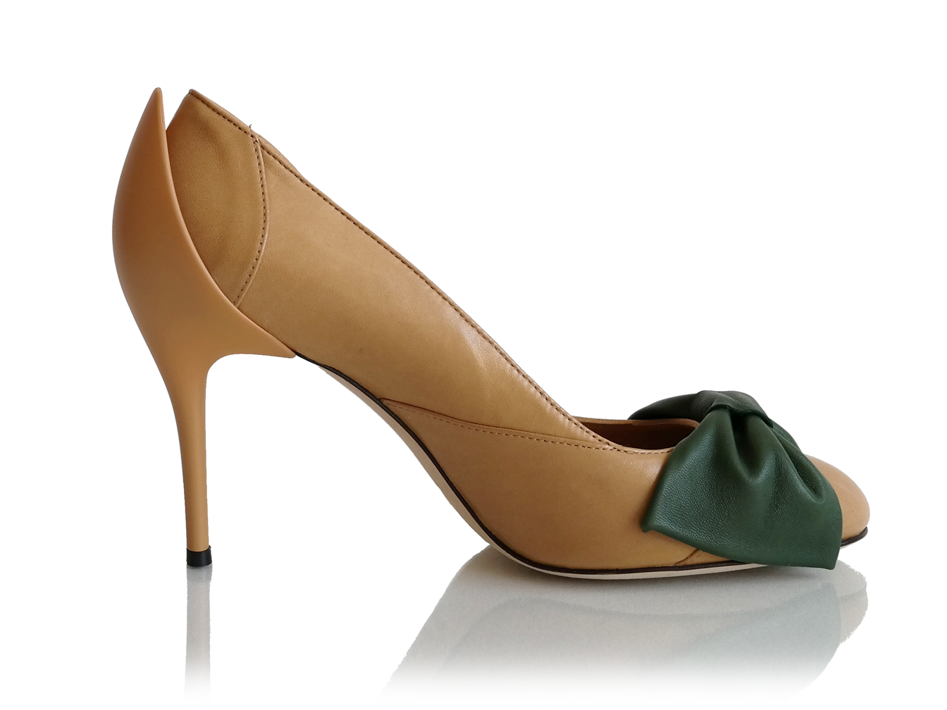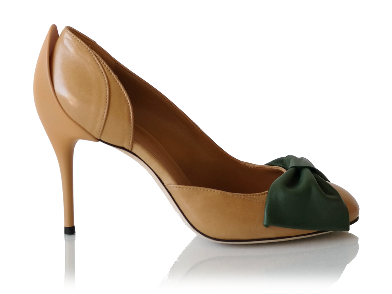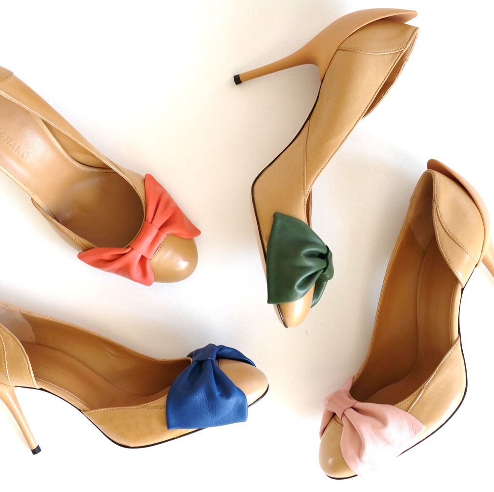 Description: Pump in sand beige with a large bow in the front and special stiletto heel. The bow is available in four colors: olive green, peach orange, blueberry blue, and strawberry ice-cream pink.