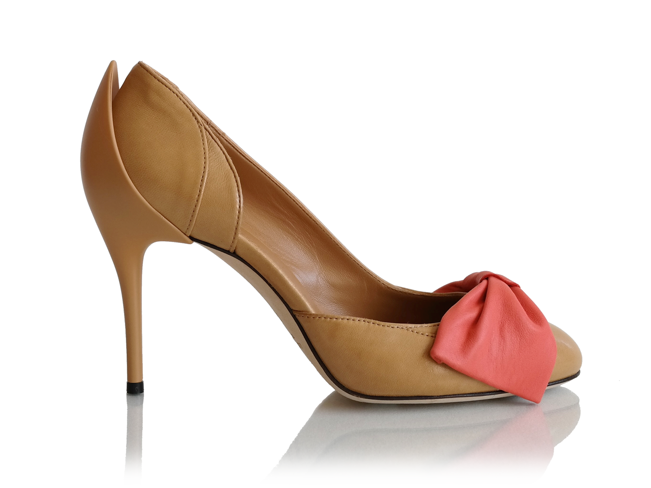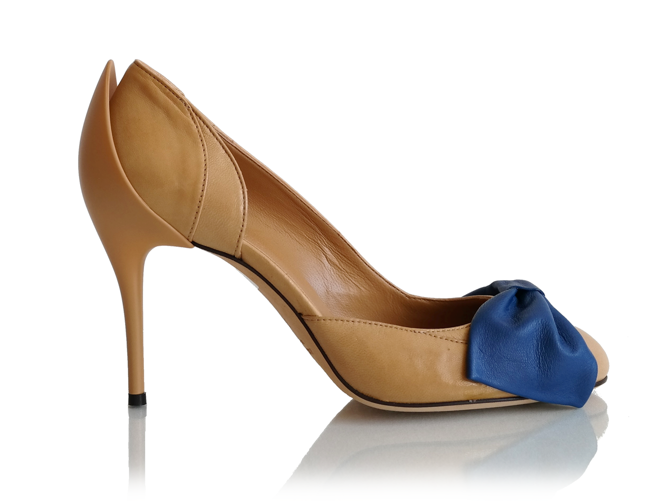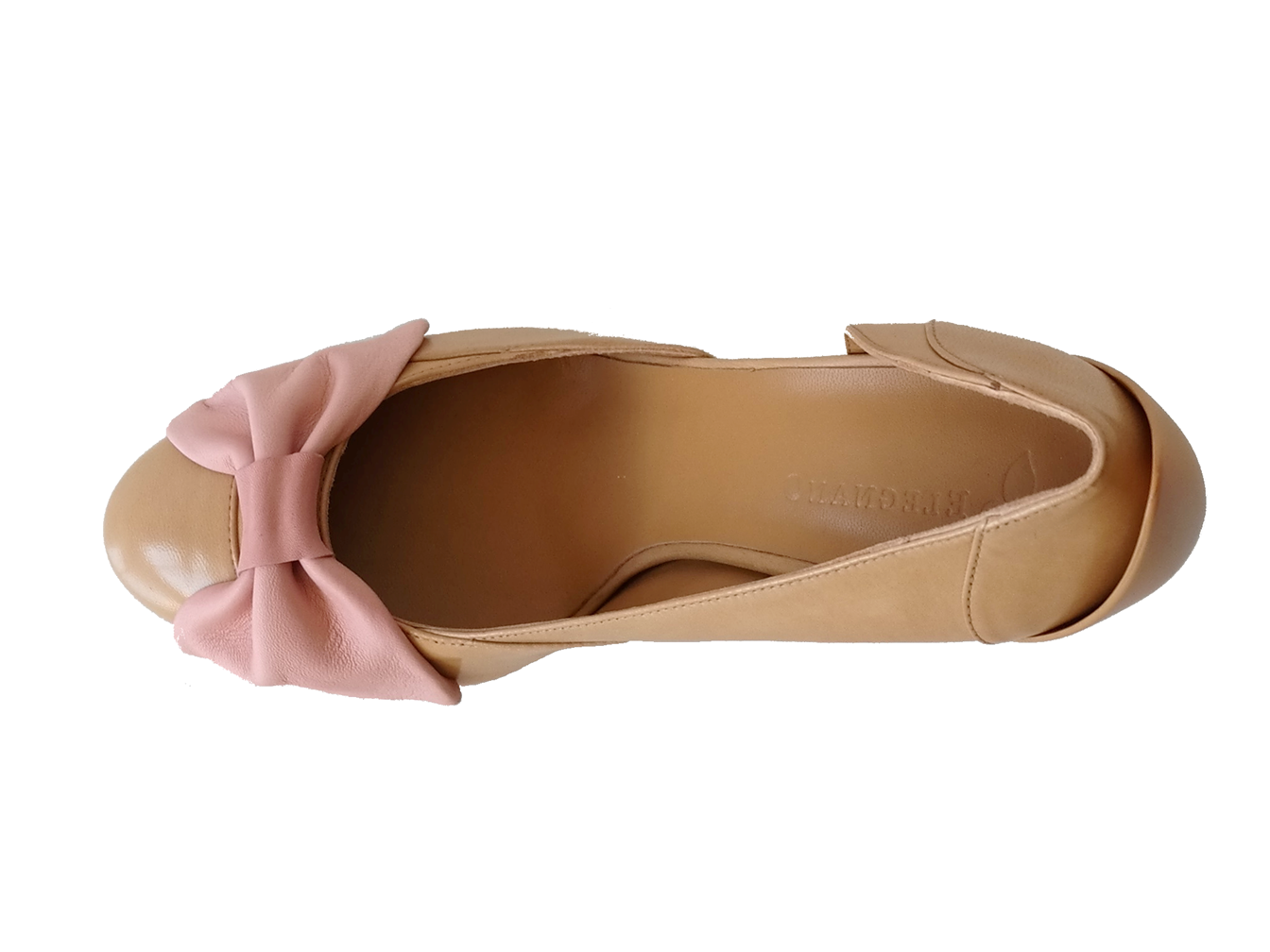 Description: Pump in sand beige with a large bow in the front and special stiletto heel. The bow is available in four colors: olive green, peach orange, blueberry blue, and strawberry ice-cream pink.